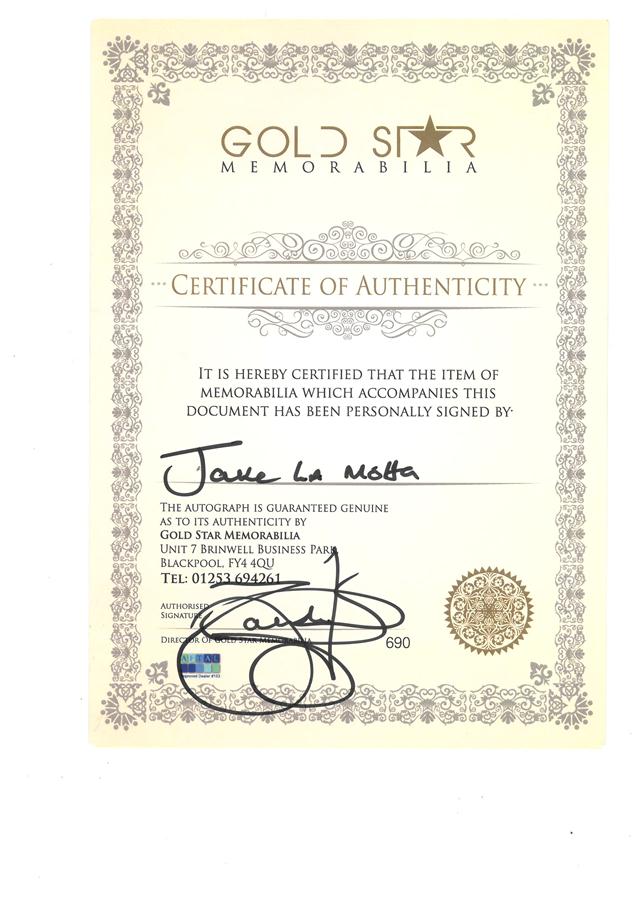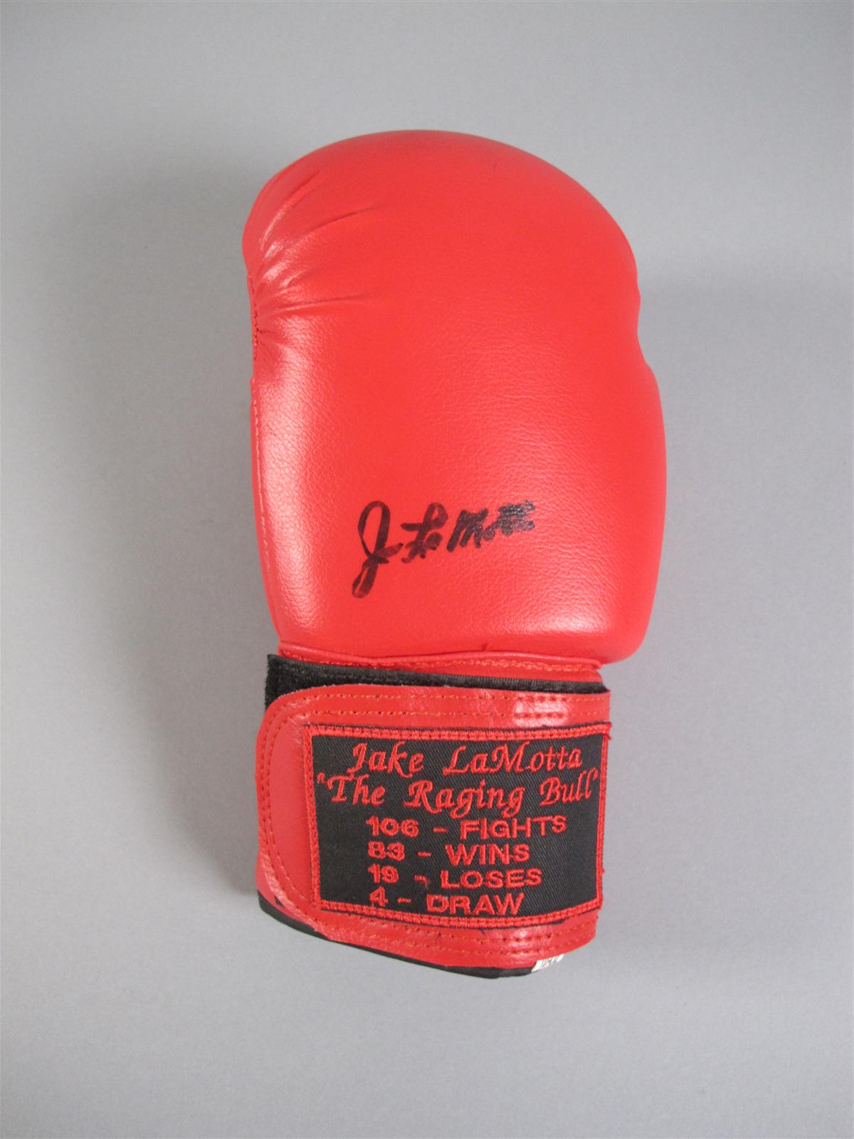 BOXE Gant de boxe de la marque Everlast en cuir rouge, signé par Jake La MOTTA. Avec son certificat d'authenticité de la Gold Star. Jake La Motta (né en 1921) fut l'un des plus grands boxeurs, Champion du Monde Italo-Américain de poids lourds-légers. Interprété par Robert de Niro dans le film biographique "Raging Bull".