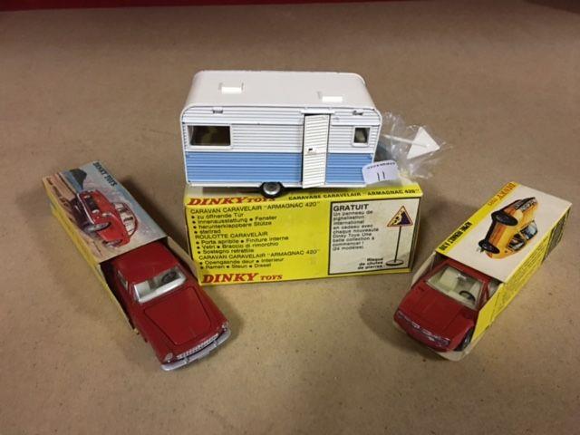 DTF : Coupé FERRARI 250 GT, rouge, réf. 515. Caravane " ARMAGNAC " 420, bleu et blanc, réf. 564. ALPINE RENAULT A 310, rouge orangé, réf. 1411.