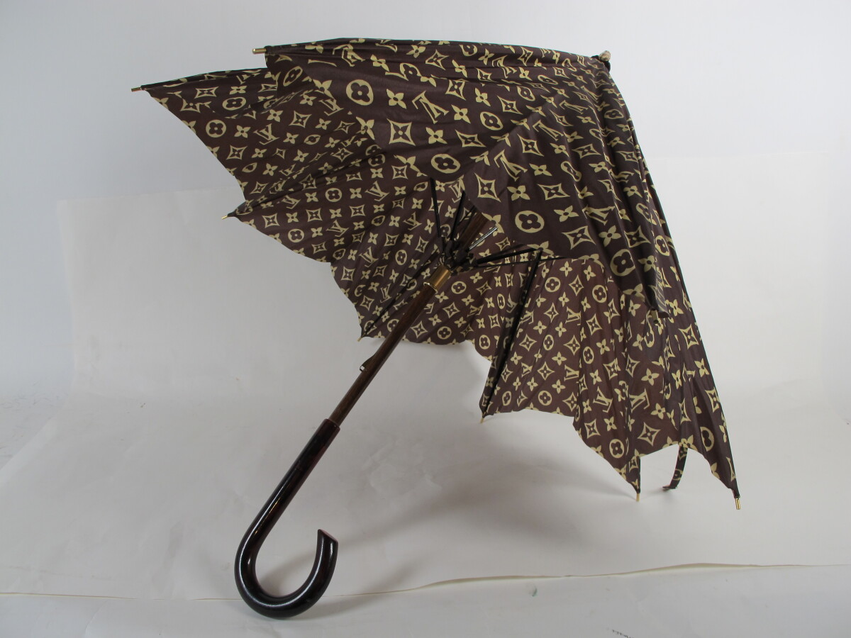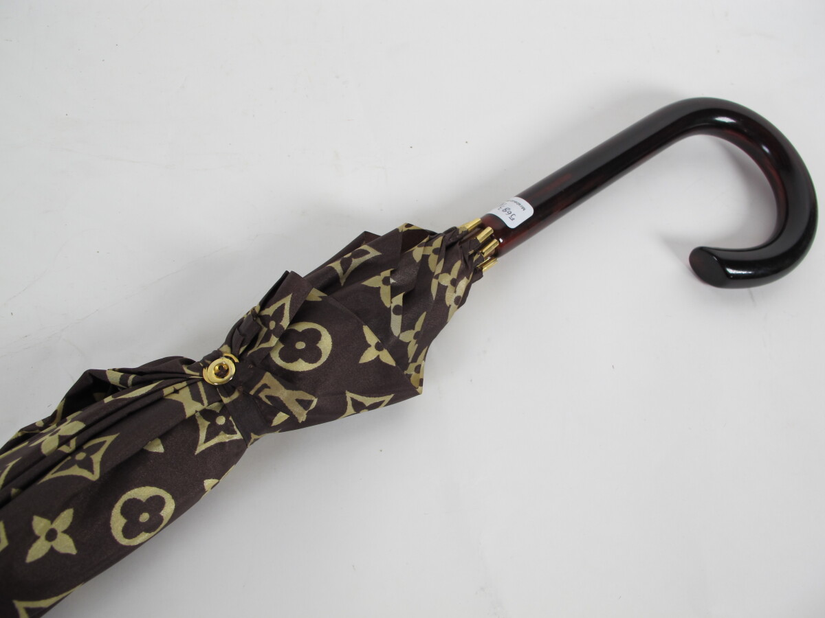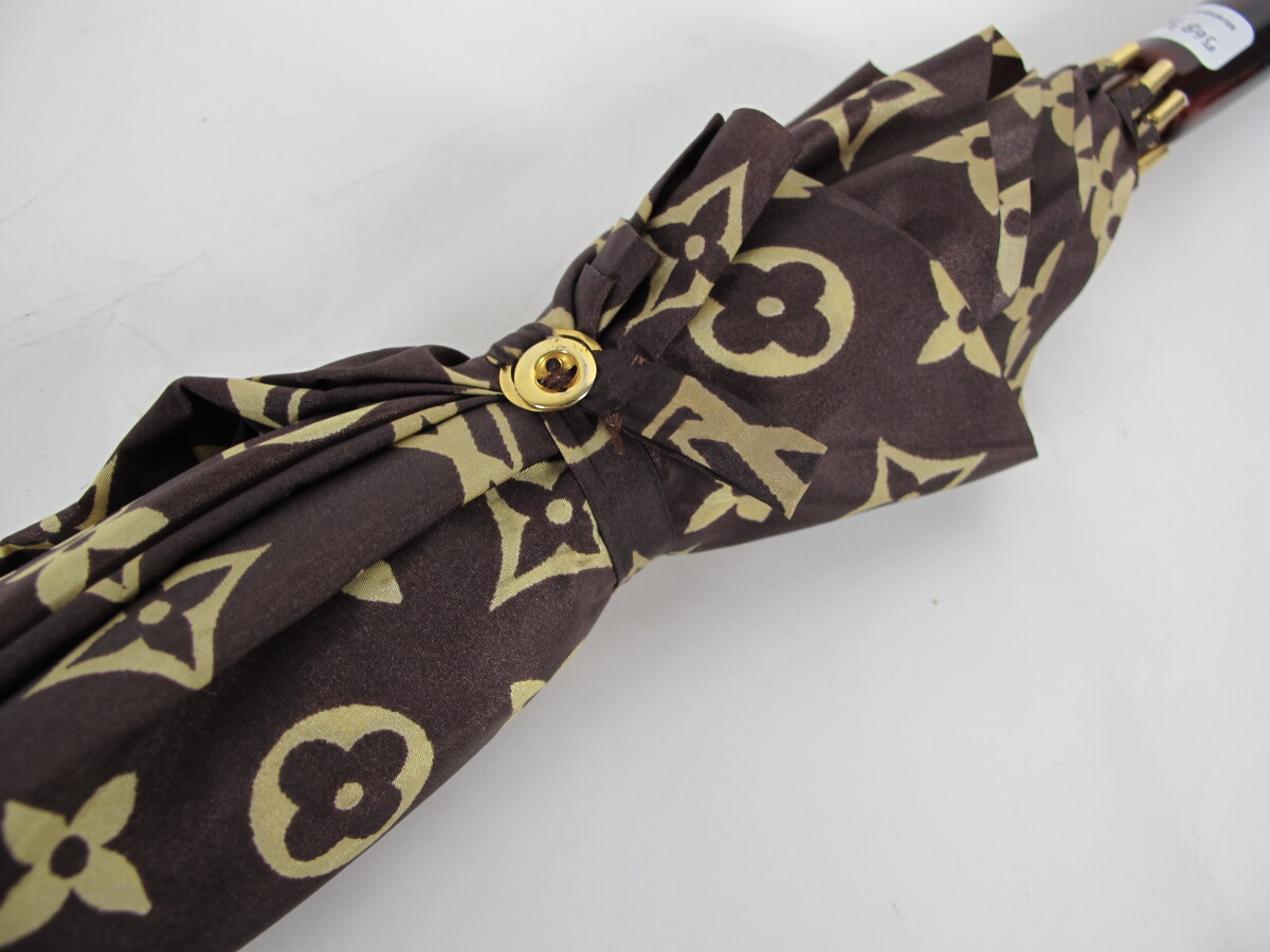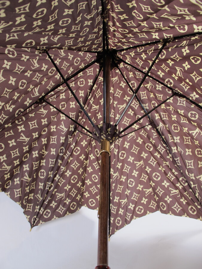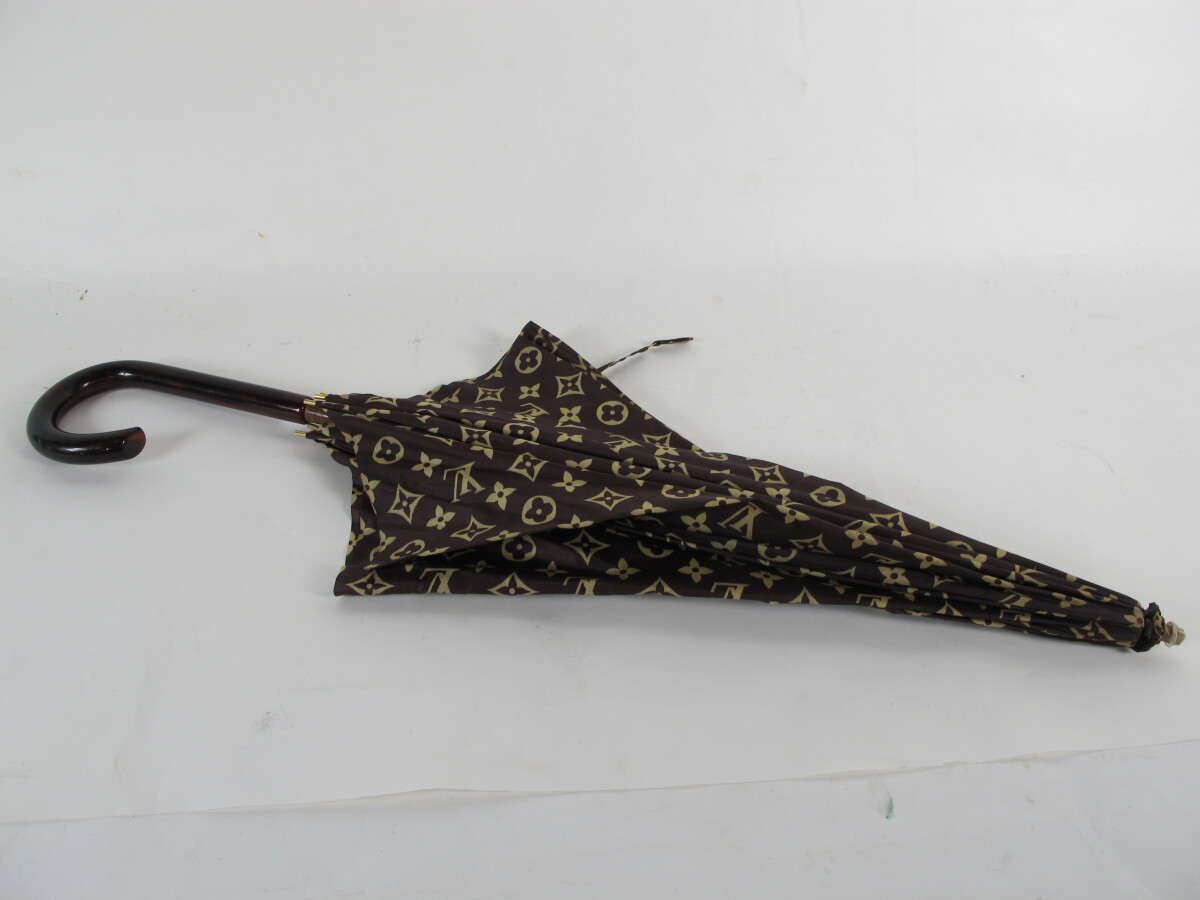 Louis VUITTON Parapluie homme en toile monogram, manche en bois réalisé par Paragon Fox Frames Sheffield England. Griffe blanche graphisme noir. Dimensions : Diamètre ouvert 77 cm. (tape à terre manquant)