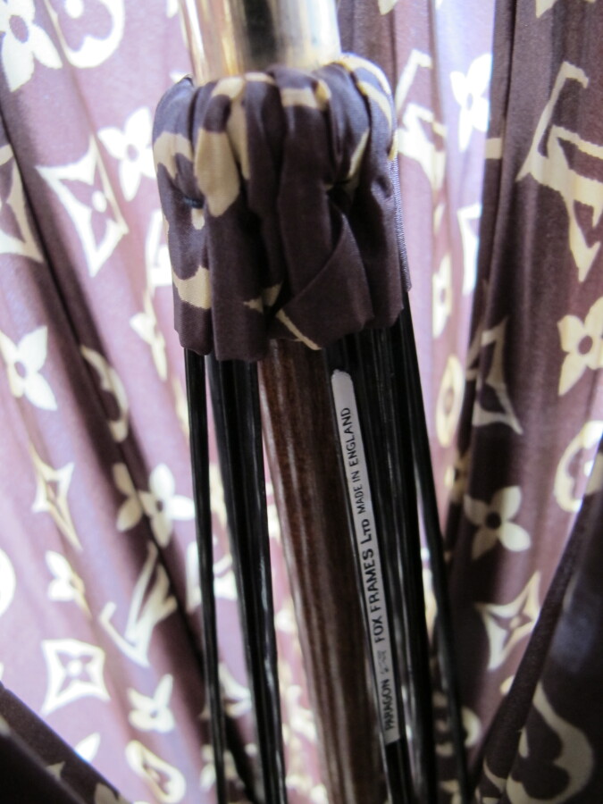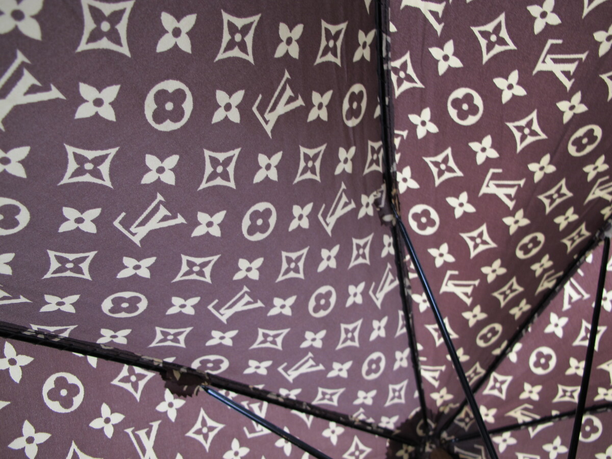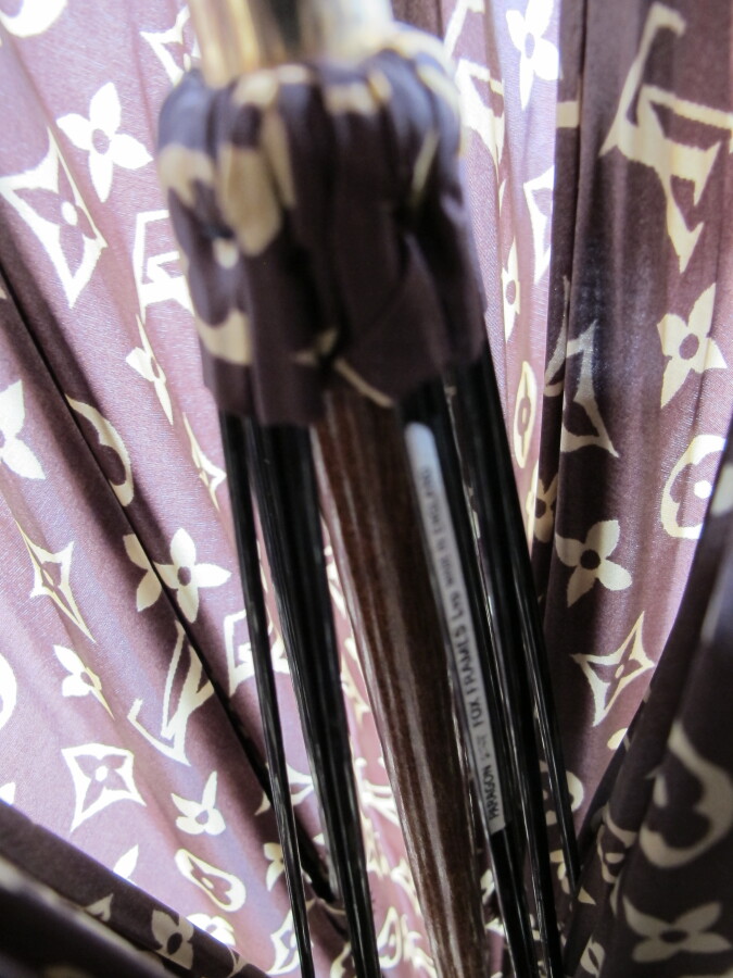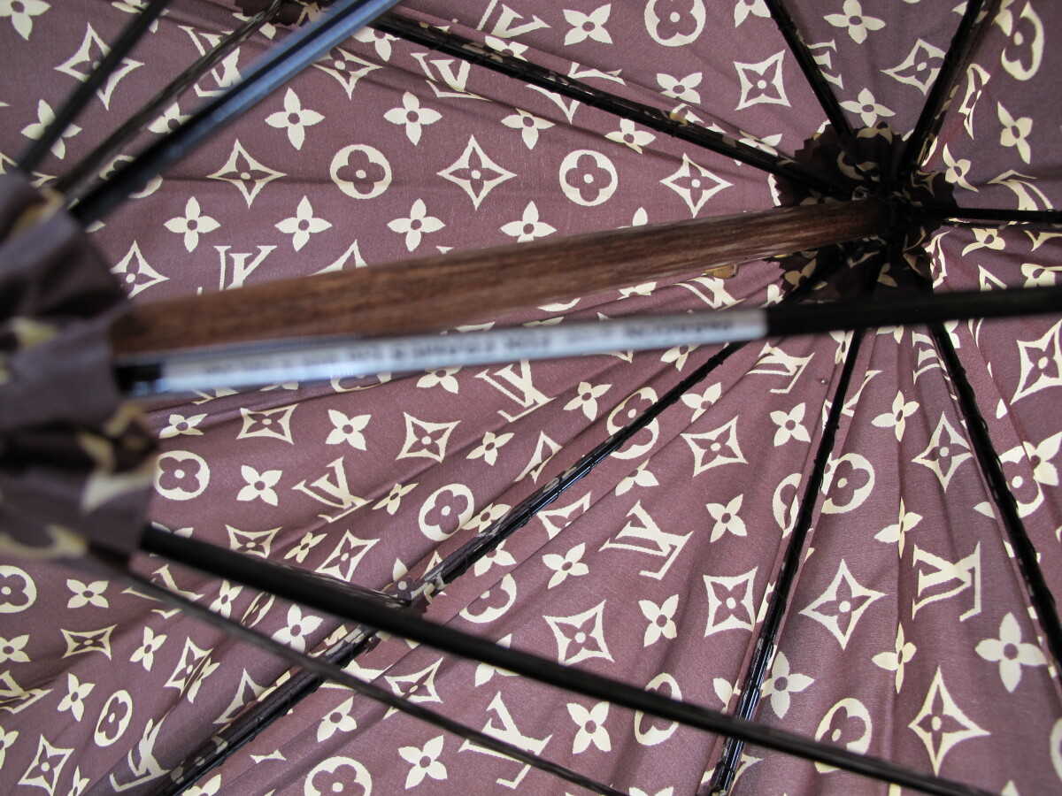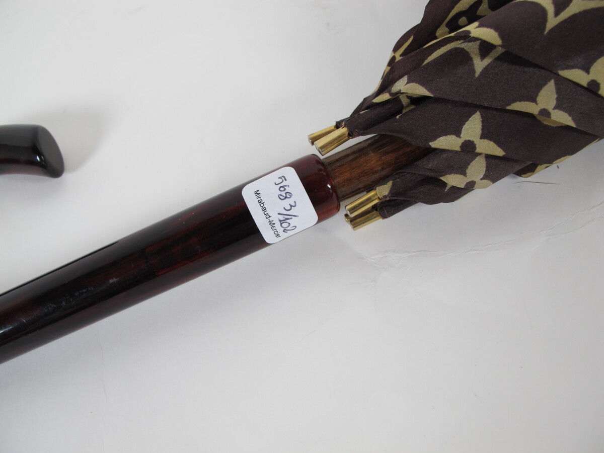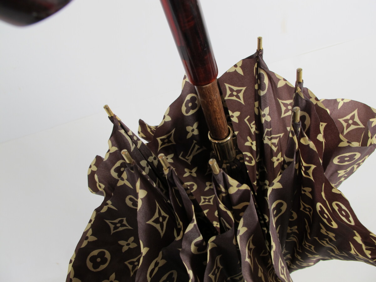 Louis VUITTON Parapluie homme en toile monogram, manche en bois réalisé par Paragon Fox Frames Sheffield England. Griffe blanche graphisme noir. Dimensions : Diamètre ouvert 77 cm. (tape à terre manquant)