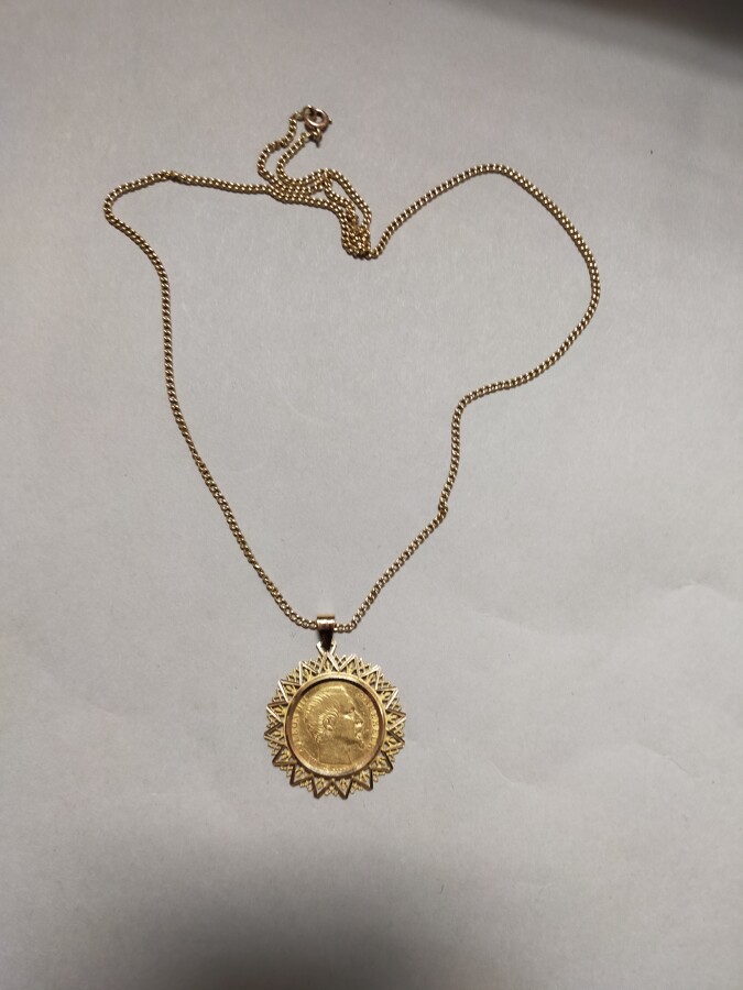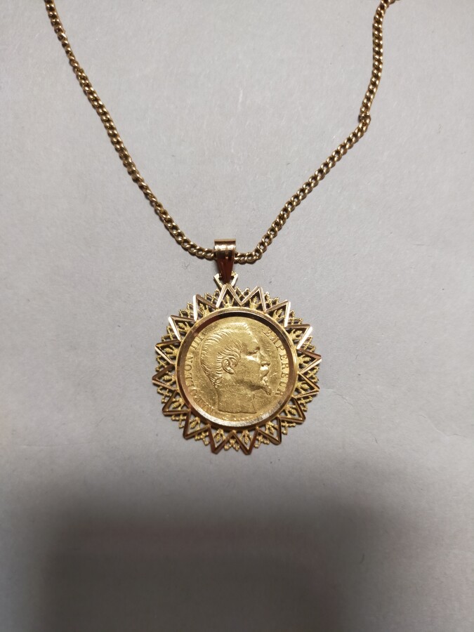 Pendentif en or jaune 18K (750 millièmes) retenant une pièce de 20 FF Napoléon III, datée 1854. Chaîne maille gourmette. Poids : 16,73 g