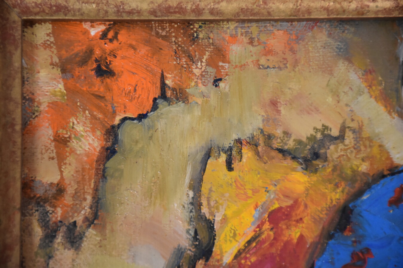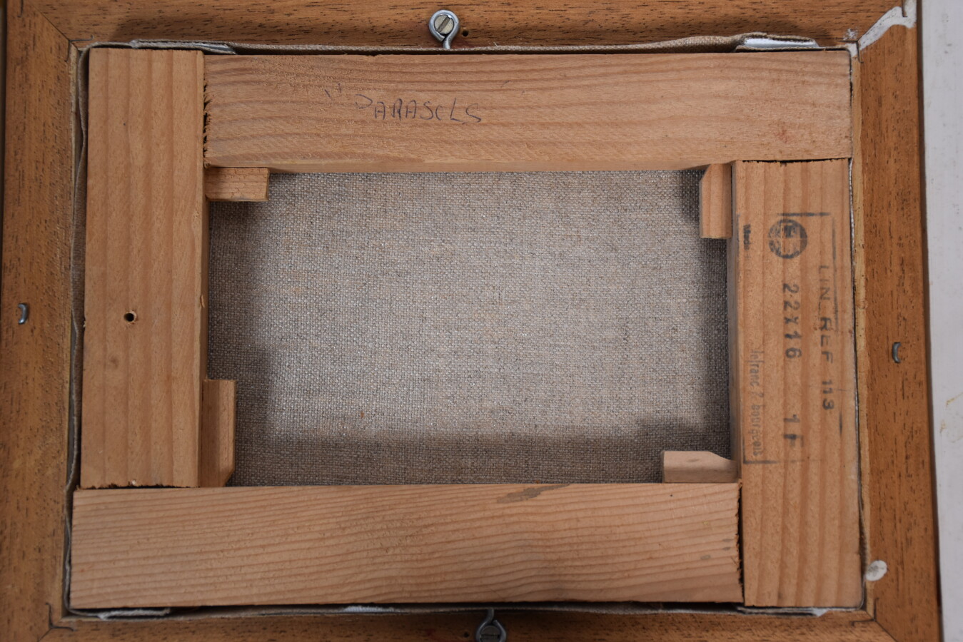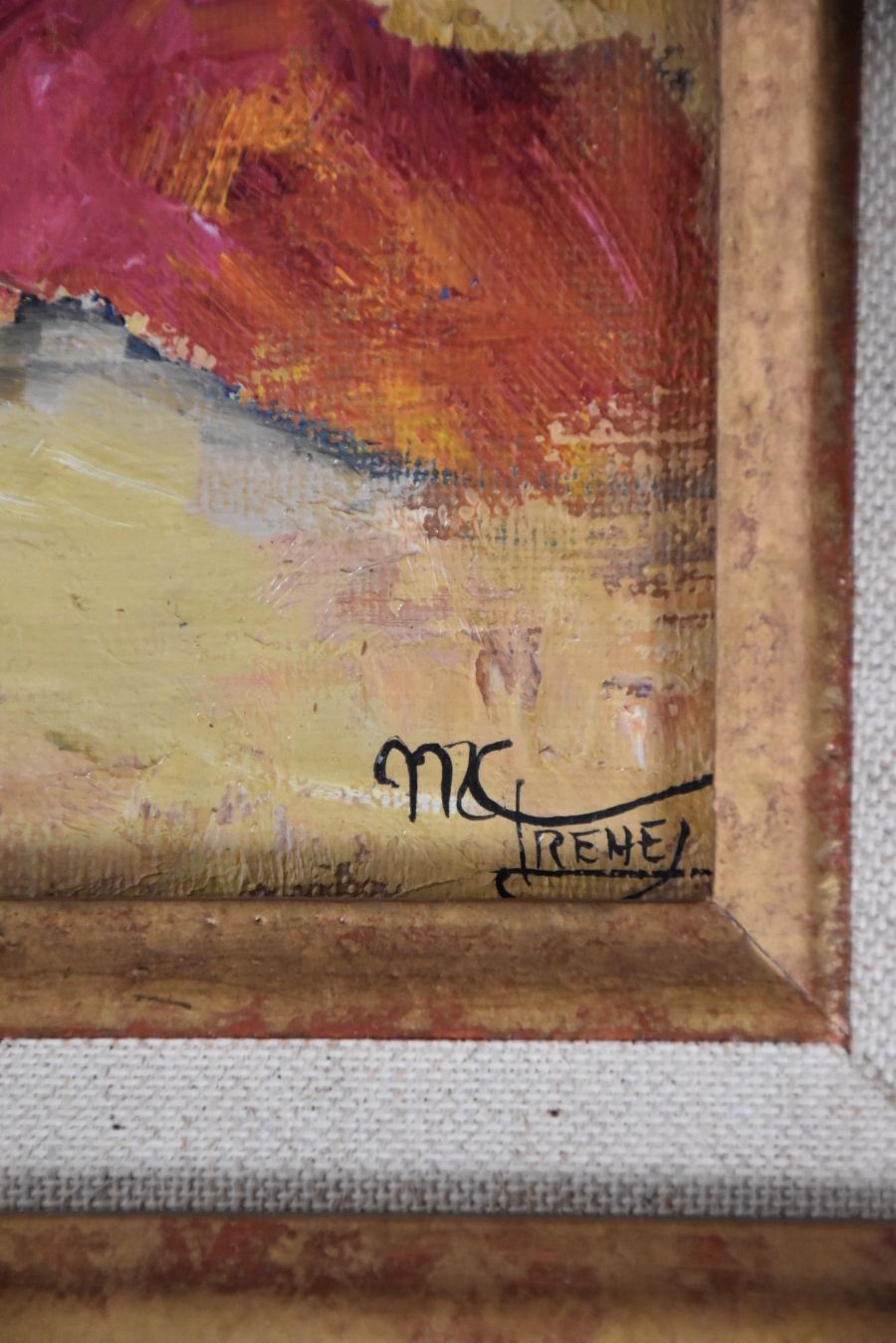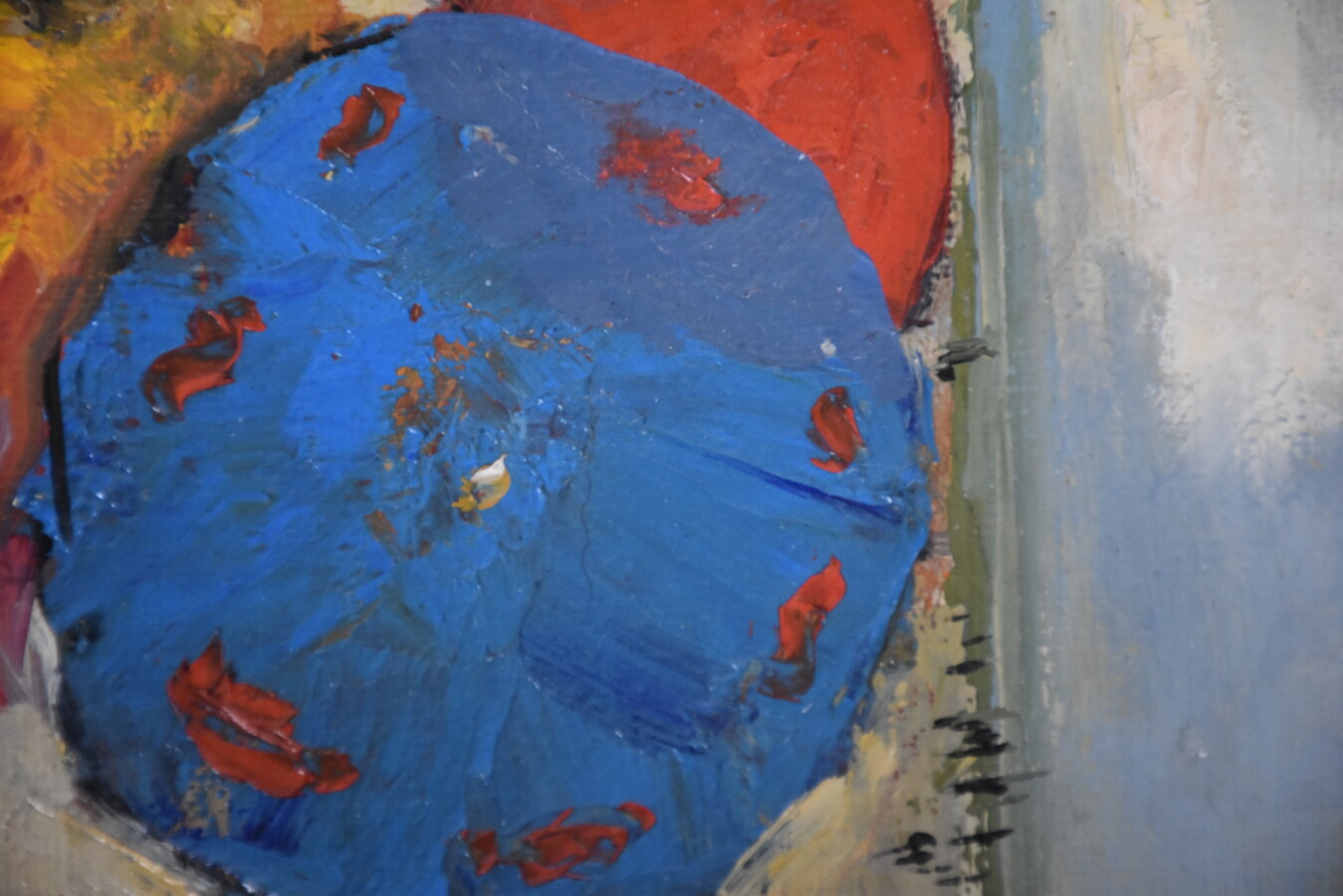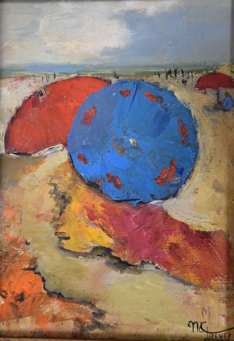 Ecole moderne Les parasols sur la plage huile sur toile signée en bas à droite 'MC TReney' Haut. : 22 ; larg. : 16 cm